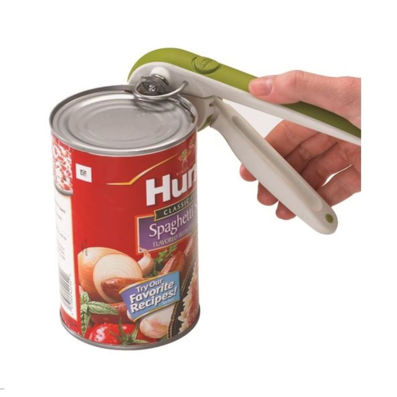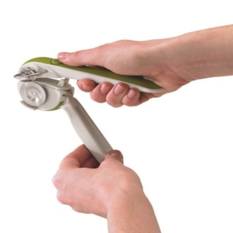 Para utilizar o abridor de latas da Chef'n é necessário somente uma mão e alguns toques nas alças de catraca para abrir as latas em um instante.