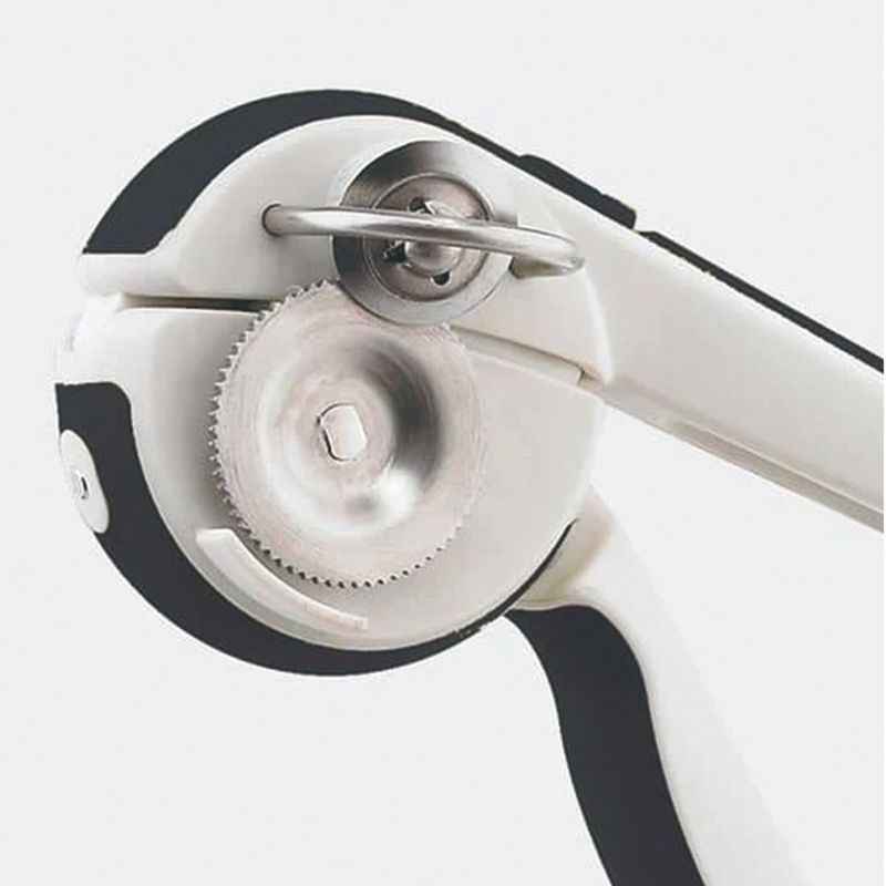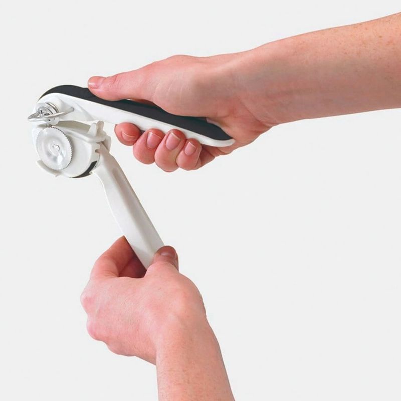Para utilizar o abridor de latas da Chef'n é necessário somente uma mão e alguns toques nas alças de catraca para abrir as latas em um instante.