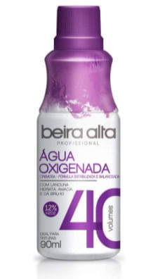 Água Oxigenada Beira Alta 40 Volumes 90ml Usada para obter resultados perfeitos com a coloração, a Água Oxigenada ou Peróxido de Hidrogênio Beira Alta é ideal para abrir as escamas do fios, para que o pigmento da coloração ou o pó descolorante penetre com mais eficiência e altere as cores dos fios. Contém Lanolina, emoliente especial para processos químicos, que hidrata, fornece brilho, e evita o ressecamento dos cabelos.