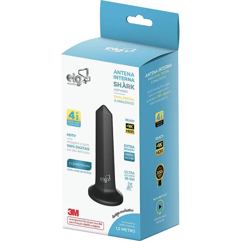 Antena Digital Interna Alcance 30Km Cabo 1,5m Shark HDTV-1500 ELG. Compacta, moderna e compatível com todos os modelos de TVs e conversores disponíveis no mercado.