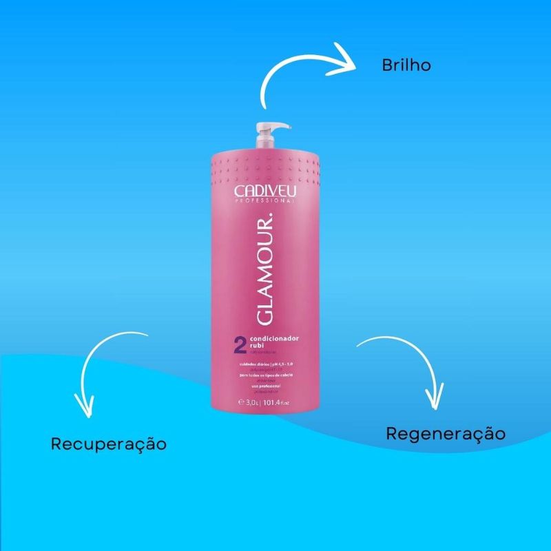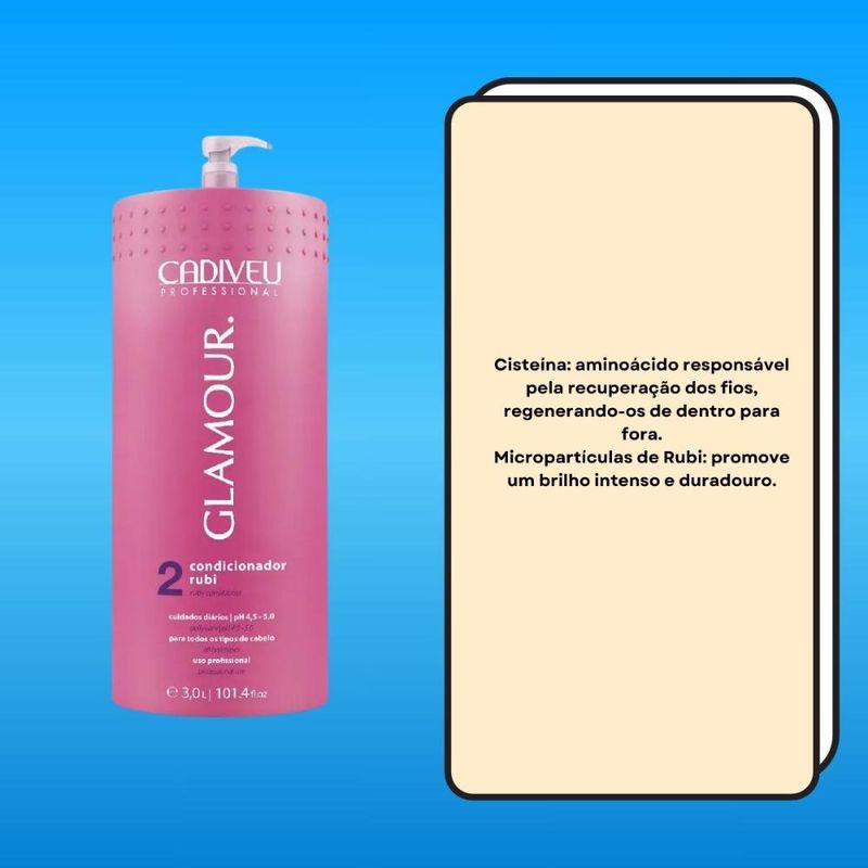 Condicionador de uso diário para cabelos quimicamente tratados, coloridos ou descoloridos. Cadiveu Professional Glamour Rubi Condicionador proporciona nutrição intensa aos fios, hidrata, elimina o frizz e regenera profundamente os fios danificados.