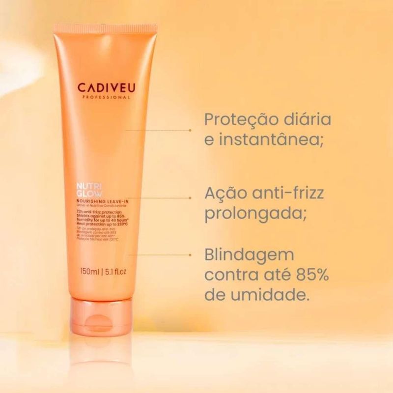 O Leave-in Cadiveu Professional Nutri Glow conta com proteção térmica de até 230ºC, que facilita a secagem e protege os cabelos contra o frizz por 72 horas. Seu uso forma um escudo protetor de umidade em até 85%, promovendo assim um penteado ideal para todos os tipos de cabelo. O resultado é um cabelo nutrido, maleável, macio e com brilho intenso.