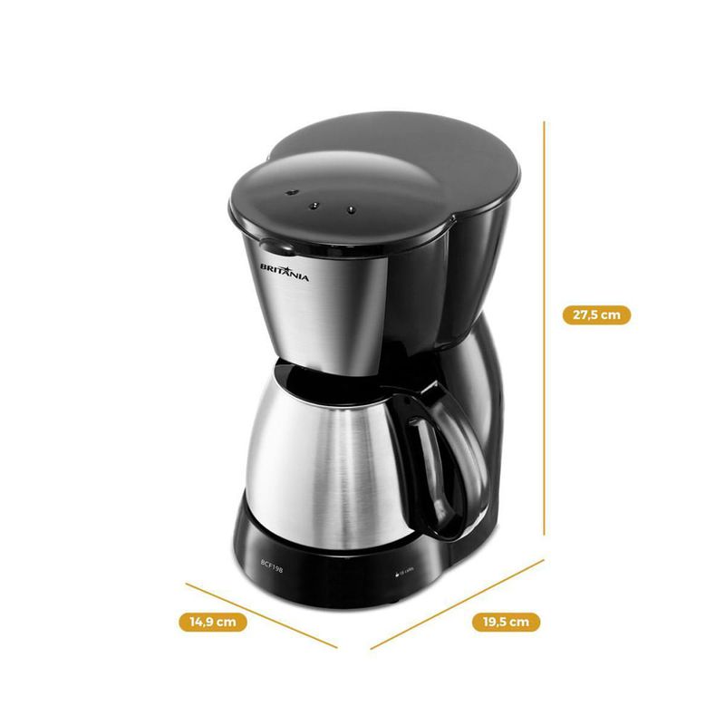 CARACTERÍSTICAS TÉCNICAS • Prepara 18 cafés; • Jarra em aço inox; • Acabamento em aço inox; • Porta filtro removível; • Filtro removível, fácil de limpar; • Colher medidora; • Sistema corta-pingos; • Reservatório com capacidade de 720ml • Base antiderrapante;