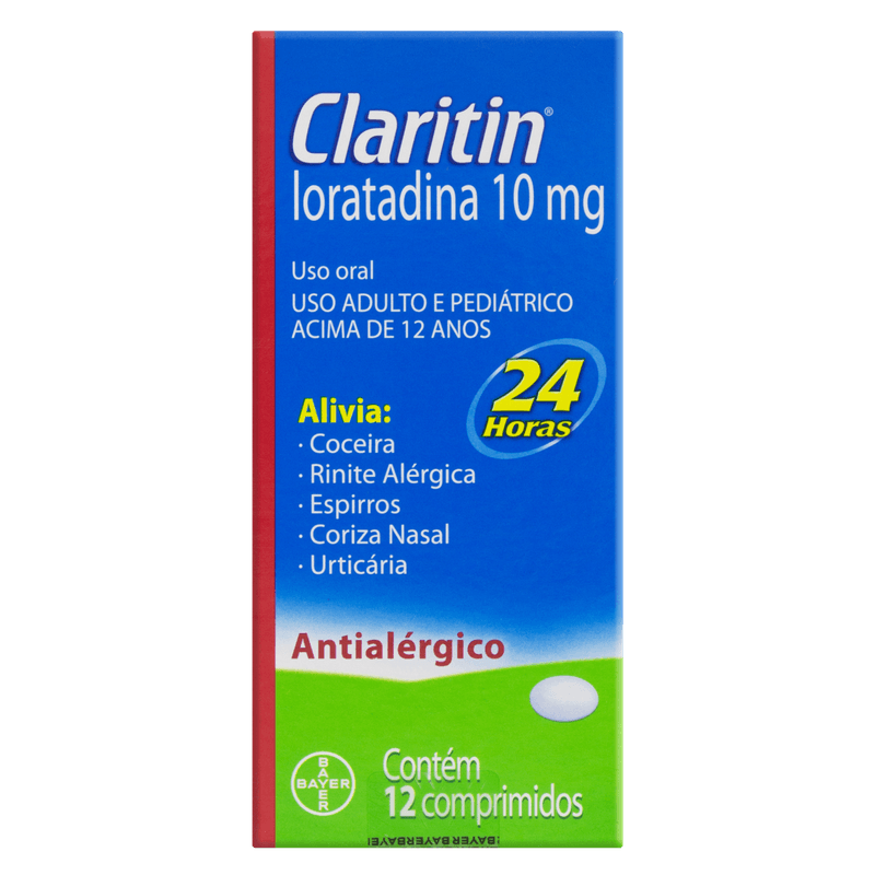 Claritin Loratadina 10mg com 12 Comprimidos é um antialérgico de ação prolongada, indicado para o alívio dos sintomas da rinite alérgica, como coceira nasal, coriza, espirros e ardor nos olhos. Também é eficaz no tratamento de urticária e outras alergias cutâneas. Sua fórmula contém 10 mg de loratadina por comprimido, proporcionando alívio por até 24 horas com uma única dose diária, sem causar sonolência.