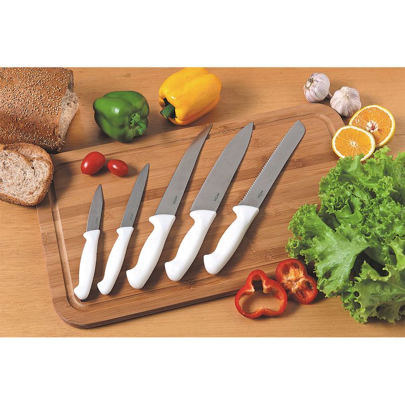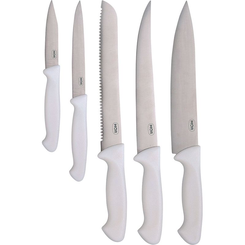 Perfeito para você que gosta de preparar uma boa receita no tempo livre. Tenha tudo que precisa em mãos, como este conjunto. Composto de 5 facas diferentes, sendo: para pão, lardear, desossar, legumes e carne, elas são fabricados em inox, com cabo resistente, para que utilize em diversos momentos durante o preparo da comida. Convide os amigos e mostre o quanto você sabe fazer um almoço ou jantar saboroso.