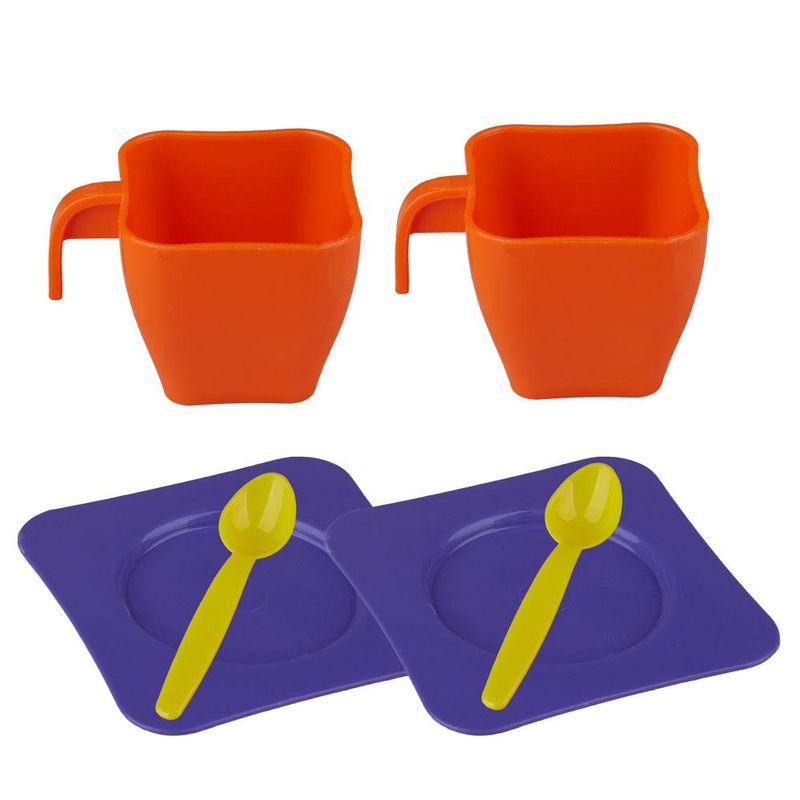 1 açucareiro,1 bule, 1 garrafa, 2 xícaras, 2 pires e 2 colheres