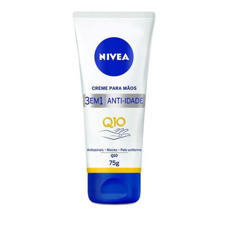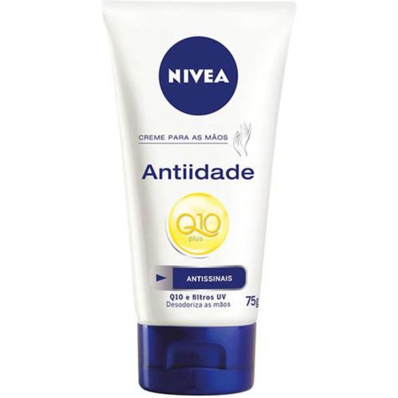 Nivea Q10 Plus Anti-idade é um creme para as mãos, desenvolvido com uma poderosa fórmula de rápida absorção com filtros UV, enriquecida com Coenzima Q10, que desodoriza e hidrata a pele das mãos, ao mesmo tempo em que previne os primeiros sinais de envelhecimento.