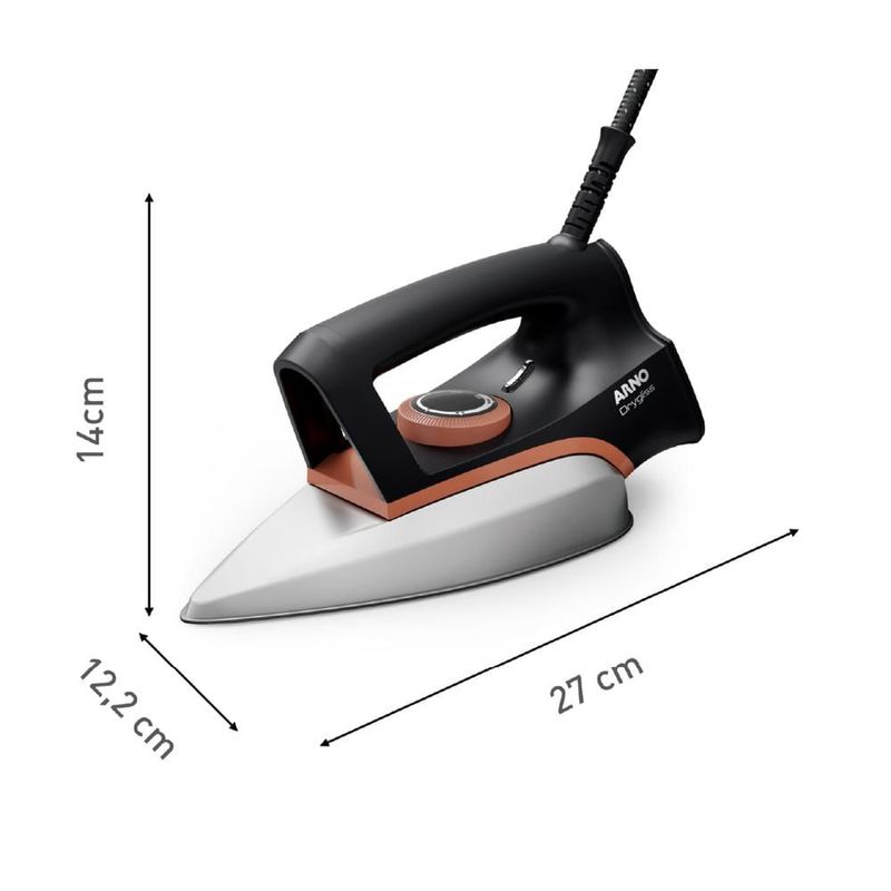 O Ferro de Passar à Seco da Arno tem base Antiaderente que não gruda nos tecidos, aquecimento rápido, design leve e ergonômico para conforto máximo e liberdade de movimento com o longo cabo de energia com giro em 360.