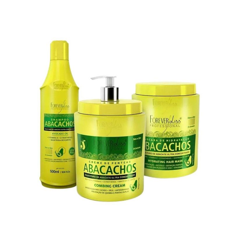 Kit Tratamento Capilar com Abacate Abacachos Forever Liss é perfeito para conquistar os cachos e curvas dos sonhos. Sua formulação possui Óleo puro de Abacate, Vitamina E, D-Pantenol e Manteiga de Karité e foi desenvolvida para deixar os cabelos cacheados, ondulados ou crespos perfeitamente hidratados e nutridos.