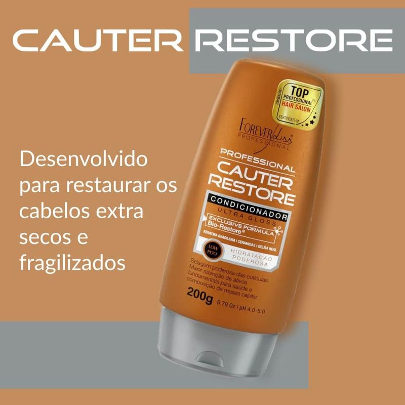 O Condicionador Cauterização Cauter Restore 200g possui fórmula especial à base de geleia real, ceramidas e keratina brasileira. Promove a estruturação da fibra capilar, regenerando os fios ressecados e fragilizados por química. Facilitando o pentear e selando completamente as cutículas deixando os fios mais emoliente, com brilho e maciez.