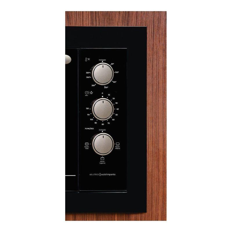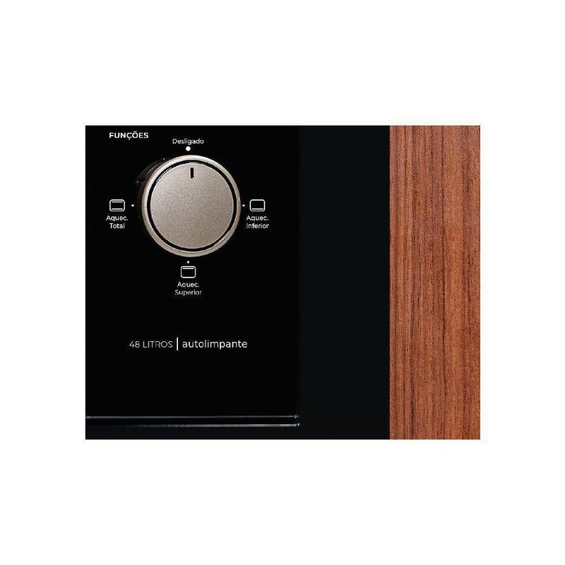 Funções: Assa, doura, tosta, gratina, aquece, Luz piloto, Lâmpada interna, Pés antiderrapantes, Porta com vidro duplo serigrafado, Corpo interno com revestimento autolimpante