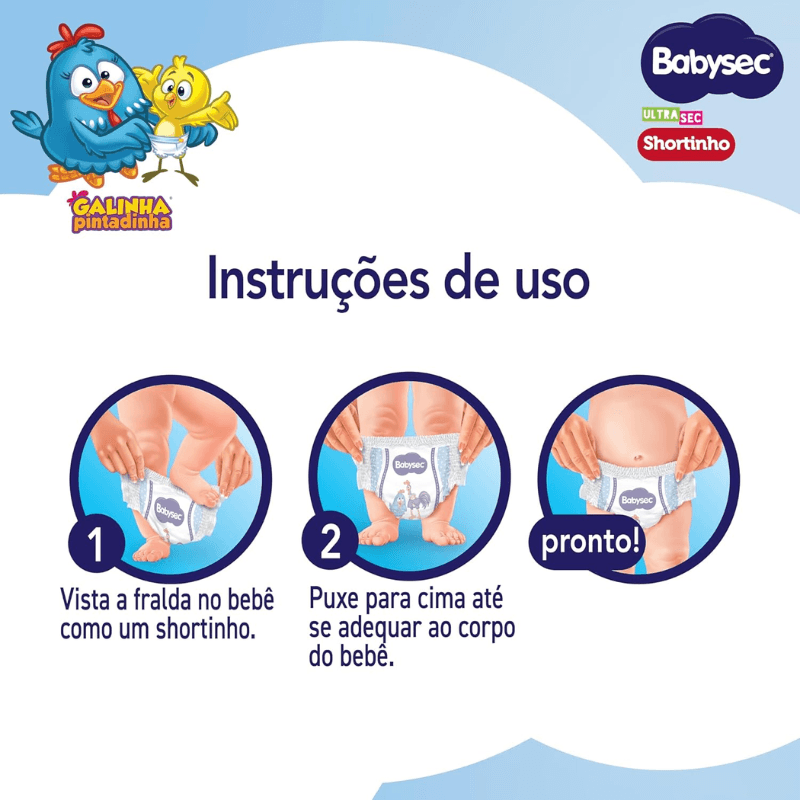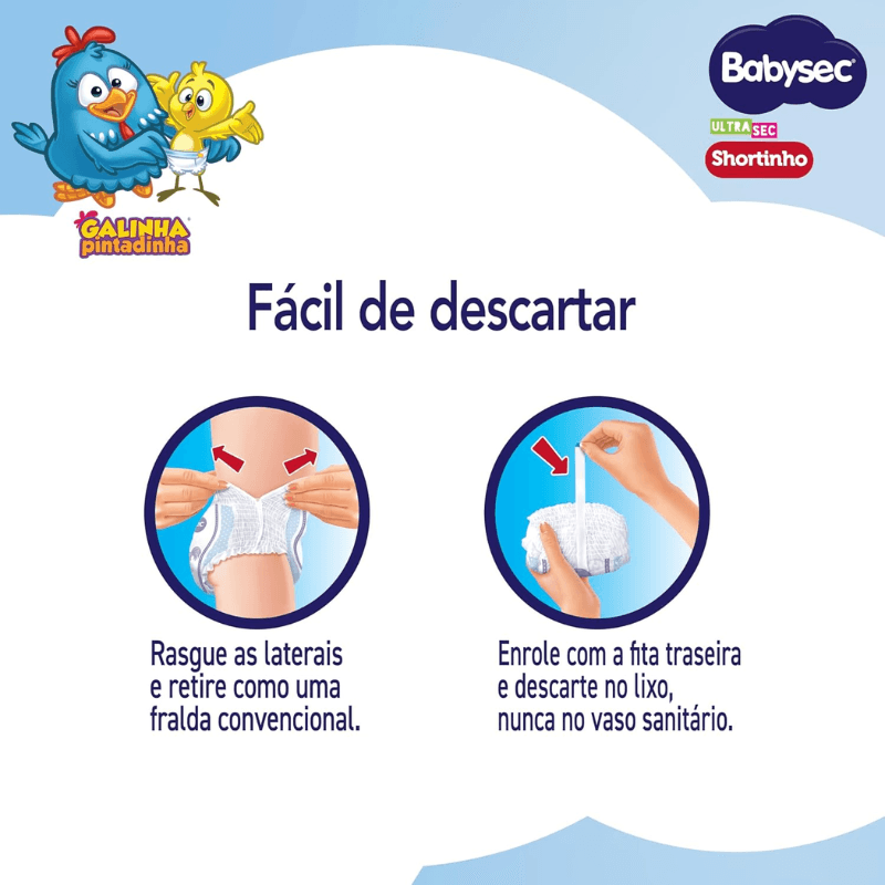 As fraldas Babysec possuem laterais elásticas com indicadores de umidade e sistema abre fácil, garantindo o melhor ajuste, conforto e proteção ao bebê. Além disso, possuem gel ultra absorvente e barreiras reforçadas, garantindo rápida absorção dos líquidos, mantendo a pele do bebê seca por mais tempo. As fraldas Babysec possuem cobertura com toque suave e decorada com vários desenhos divertidos.