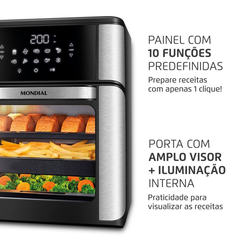 Uma das maiores vantagens deste modelo é a sua capacidade. Com 12 litros, você pode preparar refeições completas de uma só vez. Desde grandes assados até porções generosas de petiscos, a Air Fryer Forno da Mondial é perfeita para quem precisa cozinhar para muitas pessoas ou quer otimizar o tempo na cozinha.
