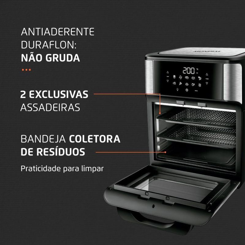 Além disso, a nossa fritadeira elétrica possui um painel digital com 10 funções pré-definidas para preparar uma variedade de pratos, desde pizzas a legumes assados. E para tornar a limpeza ainda mais fácil, ela vem com uma bandeja coletora de resíduos e assadeiras com revestimento antiaderente. Com acabamento em inox e fácil de limpar, tornando-se um ótimo complemento para a sua cozinha.