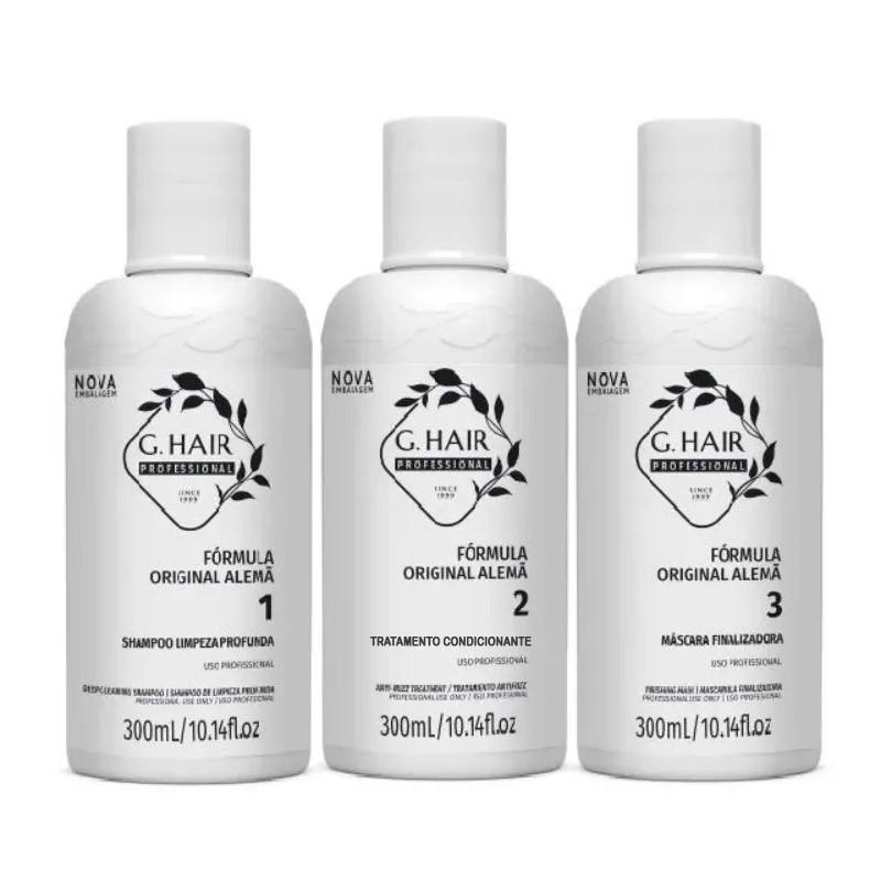 G.Hair Shampoo 300ml: Shampoo especialmente indicado para tratar e limpar o cabelo dos resíduos de poluição, químicas, coloração, descoloração, etc. Limpa e auxilia na abertura das escamas e das cutículas dos fios, deixando os cabelos prontos para o tratamento capilar.