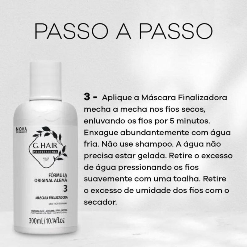 3 - G Hair Máscara Finalizadora: Sem enxaguar o Anti Volume G Hair, aguarde 15 minutos para esfriar os cabelos, após o tempo de pausa, enxágue somente com água em abundância. Retire o excesso de água com uma toalha e aplique a Máscara Finalizadora G Hair Step 3 , deixando agir por 5 minutos. Após o tempo de pausa enxágue e proceda com a finalização desejada