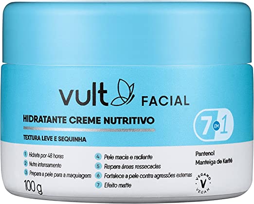 O que é e para que serve o Hidratante Creme Nutritivo Vult Facial? Formulado com Pantenol e Manteiga de Karité, ativos reconhecidos pelo alto poder de hidratação e reparação da pele, creme nutritivo hidratante Vult Facial oferece 7 benefícios em um único produto: Como usar o Hidratante Creme Nutritivo Vult Facial? Pela manhã, com a pele limpa e seca, aplique o produto por todo o rosto e pescoço e massageie suavemente. Ideal para uso diário.