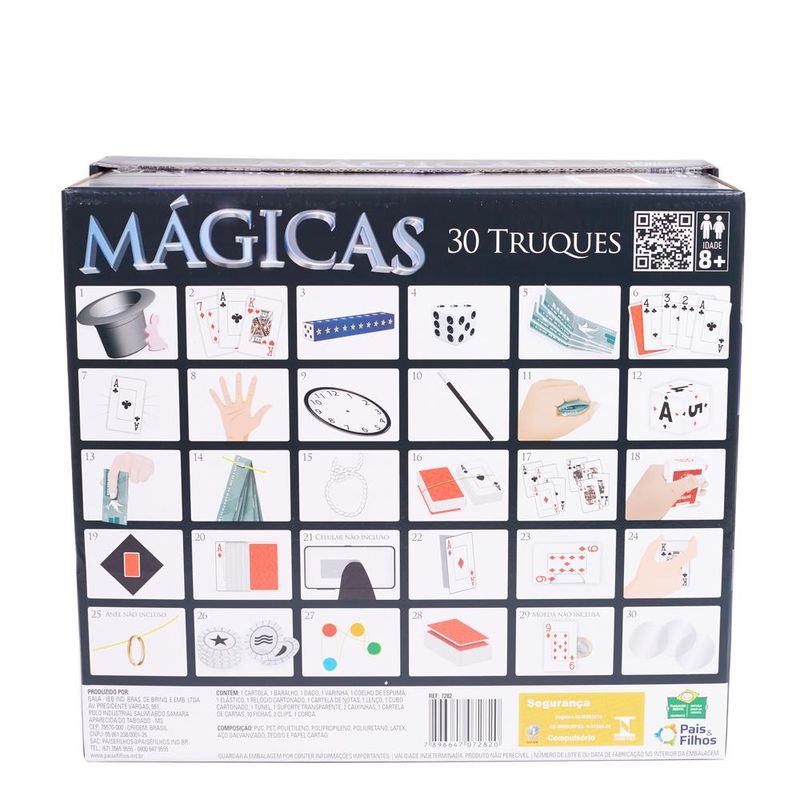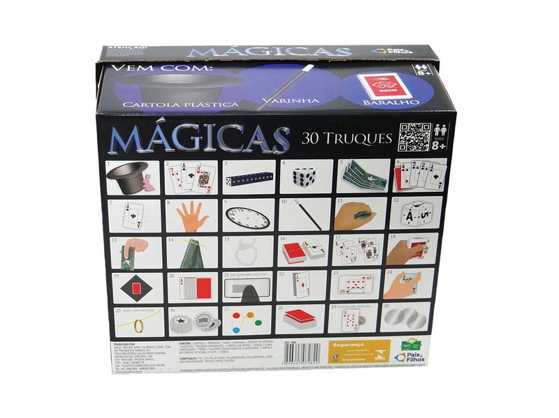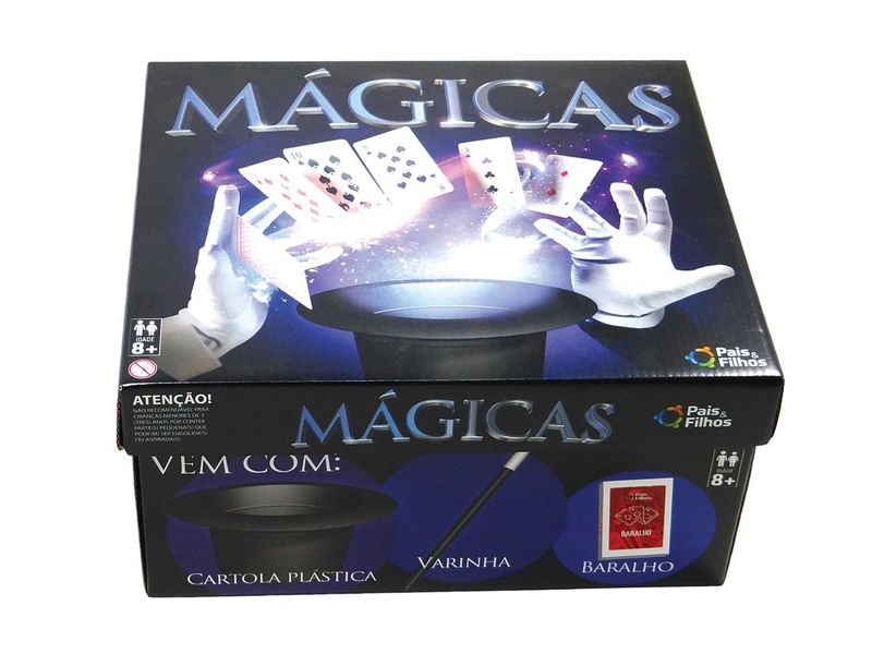 Para um dia diferente com magia... Respeitável público, o show de mágicas vai começar. Prepare-se para ficar encantado com um kit de mágica infantil com 30 truques incríveis. As crianças vão amar o Jogo Mágicas Pais Filhos 7282, uma Caixa de Mágicas com coelho e cartola da Pais e Filhos. INFORMAÇÕES: Contém: - 1 Cartela, 1 Baralho, 1 Dado, 1 Varinha, 1 Coelho de espuma, 1 Elástico,1 relógio cartonado, 1 cartela de notas, 1 lenço, 1 cubo cartonado, 1 túnel, 1 suporte transparente, 2 caixinhas, 1 cartela de cartas, 10 fichas, 2 clips, 1 corda, 1 cartola Recomendação: para crianças a partir de 8 anos Aviso: As imagens são meramente ilustrativas. As cores e estampas dos produtos podem conter variações. Garanta o seu Jogo Mágicas 7282 Pais Filhos com o melhor preço do mercado