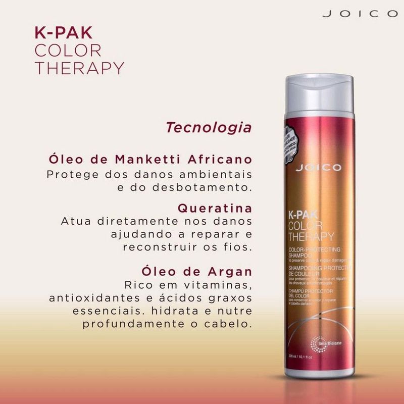 O shampoo Joico K-Pak Color Therapy limpa os fios suavemente e protege a cor dos cabelos. Sua fórmula restaura os cabelos danificados, aumentando a sua força e brilho. Foi vencedor do Prêmio Nova de Beleza 2012, na categoria "Xampu e Condicionador para Cabelo Colorido".