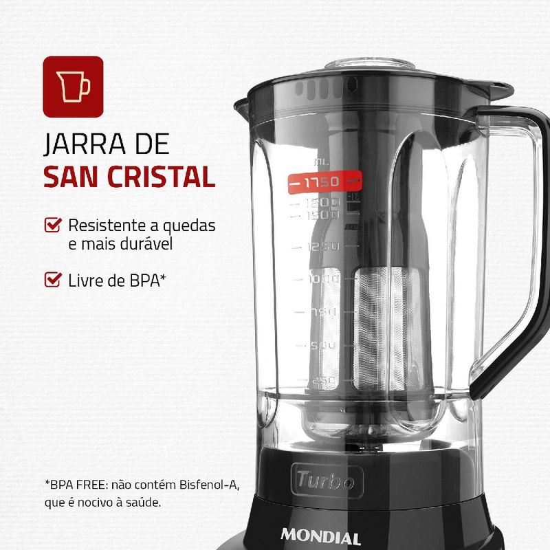 Se queres mais praticidade em sua cozinha, então tenhas esse Liquidificador com Filtro Mondial Turbo L-900 FB . Com copo de 2,7 litros em sua jarra, você pode fazer vitaminas, shakes, caldos, como também misturas que vão servir em suas receitas como pastas e recheios. Um mundo de possibilidades. Com potência de 900W, ele conta com super5 velocidades , garantindo ótimos resultados de imediato, e ainda tem função pulsar, no qual usará toda a força do motor para fazer misturas mais homogêneas e mais rápido. Ele também trituragelo, para a sua bebida já vir preparada gelada. Ele possui filtro, no qual você pode separar a semente do suco e bagaço, para uma bebida sem nenhum pedacinho, perfeito para dar para a criançada. Ou se preferir beber algo mais suave. Sua tampatem bocal, no qual pode inserir alimentos durante o preparo, não precisando parar o processamento, sem sujar sua cozinha. Ele também é auto limpante, bastando colocar um pouco de detergente junto de água dentro do copo e colocar o botão nesta função. Muito simples. Depois basta enxaguar com água corrente. Design arrojado, dando um toque moderno na sua cozinha. Perfeito para ter na bancada. Aproveite a oferta e garanta o seu Liquidificador com Filtro Mondial Turbo L-900 FB com o menor preço!