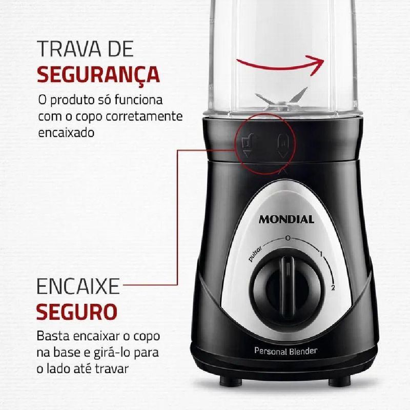 Leve suas bebidas favoritas para onde quiser com o Personal Blender da Mondial. Com 300W de potência, ele prepara sucos, vitaminas, shakes e coquetéis com eficiência. Os 2 copos de 750ml são super-resistentes e se transformam em squeezes, facilitando o transporte para a academia, escritório ou qualquer lugar. As lâminas em aço inox são ideais para triturar frutas e até cubos de gelo. O design compacto e desmontável facilita o armazenamento. A trava de segurança do Personal Blender Mondial funciona assim: Primeiro, conecte o plugue na tomada, garantindo que a tensão elétrica seja compatível. Coloque os ingredientes no Copo, respeitando os limites de capacidade 750ml para líquidos e 50% para secos e evitando ingredientes quentes acima de 80°C. Vire o Copo para encaixar a lâmina e fixe-o na Base Motora, girando no sentido horário. Essa ação ativa a trava de segurança, permitindo o funcionamento do aparelho. Após garantir que tudo está montado e travado, você pode girar o Seletor de Velocidades e iniciar o processamento. Se as lâminas travarem, desligue o aparelho e retire o plugue antes de remover os ingredientes. Após o uso, sempre retire o plugue da tomada e siga os cuidados de limpeza recomendados. A trava de segurança garante que o aparelho funcione apenas quando tudo está corretamente montado, evitando acidentes.
