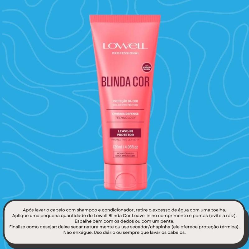 O Lowell Blinda Cor Leave-in Protetor 120ml é um produto sem enxágue (leave-in) desenvolvido especialmente para proteger e prolongar a cor dos cabelos tingidos, oferecendo também benefícios de hidratação, brilho e proteção térmica.
