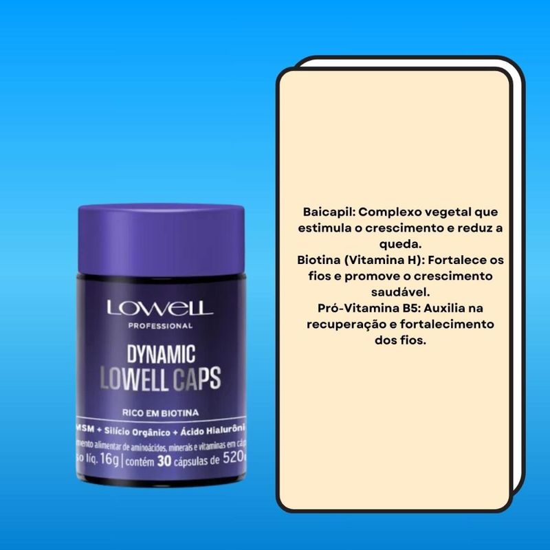 O Lowell Dynamic Caps é um suplemento alimentar em cápsulas desenvolvido para fortalecer os cabelos, reduzir a queda e estimular o crescimento saudável dos fios, tratando de dentro para fora. Além disso, também contribui para unhas mais fortes e uma pele com aparência jovem e revitalizada.