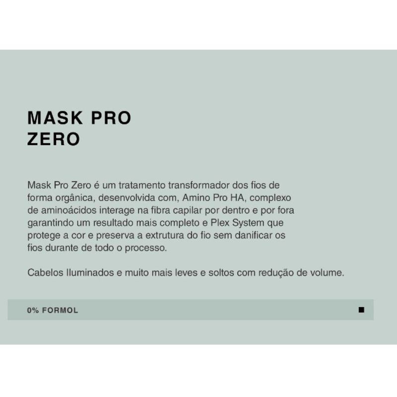 Mask Pro Zero é um tratamento transformador dos fios de forma orgânica, desenvolvida com, Amino Pro HA, complexo de aminoácidos interage na fibra capilar por dentro e por fora garantindo um resultado mais completo e Plex System que protege a cor e preserva a extrutura do fio sem danificar os fios durante de todo o processo.