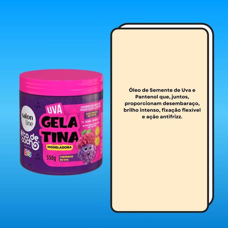 A Gelatina Modeladora #todecacho Kids Uva garante desembaraço, brilho intenso, fixação flexível e ação antifrizz aos cachinhos. Testada dermatologicamente.