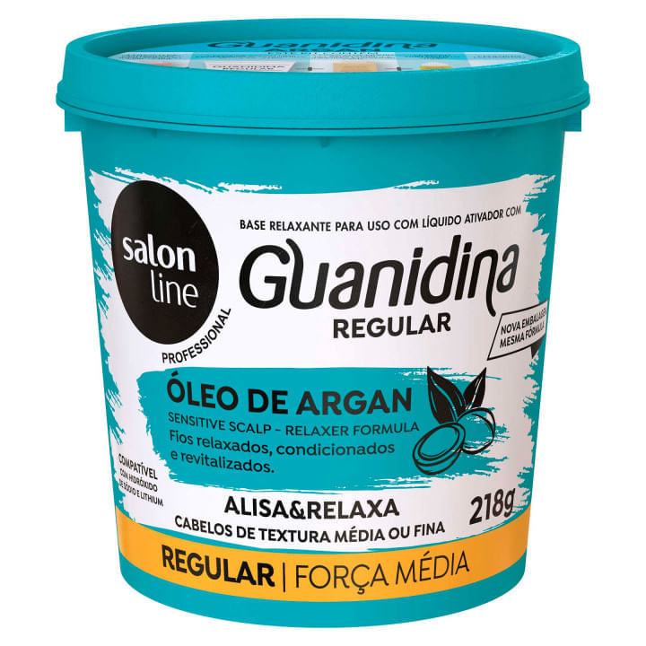 Salon Line Guanidina Óleo de Argan alisa, relaxa e reduz o volume dos cabelos, deixando-os mais lisos e soltos. Sua fórmula proporciona um resultado rápido e eficiente, além de conter Óleo de Argan, que promove brilho e maciez aos fios. A Guanidina é compatível com Hidróxido de Sódio e Lithium, e incompatível com Tioglicolato de Amônia.