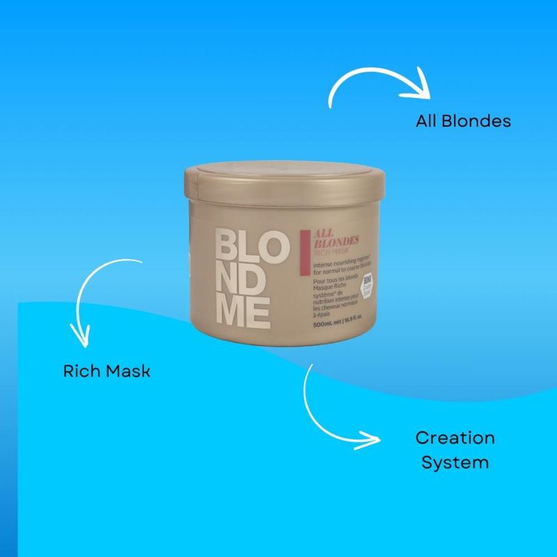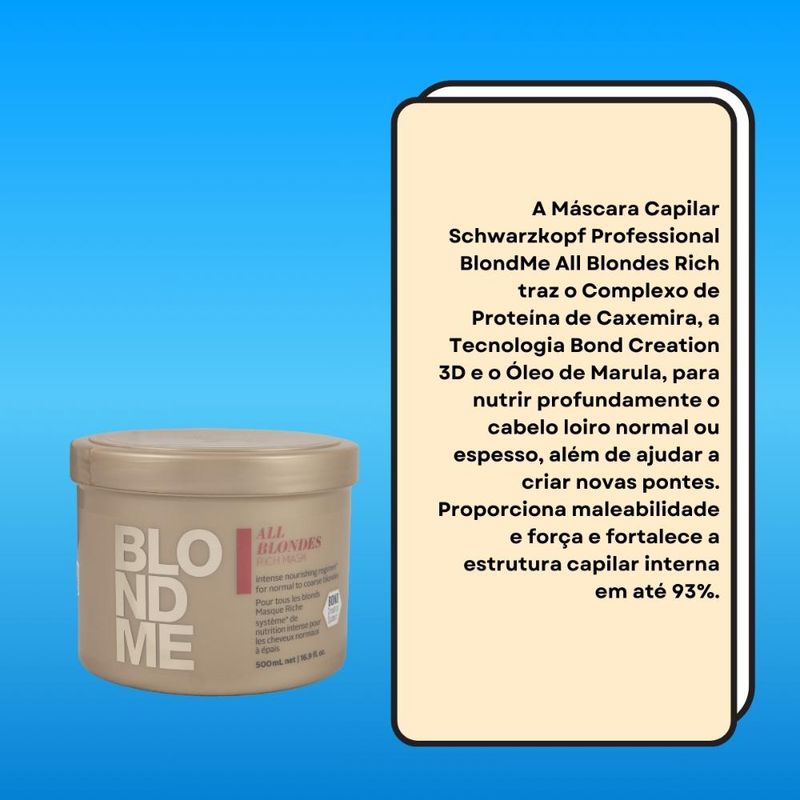A Máscara Capilar Schwarzkopf Professional BlondMe All Blondes Rich traz o Complexo de Proteína de Caxemira, a Tecnologia Bond Creation 3D e o Óleo de Marula, para nutrir profundamente o cabelo loiro normal ou espesso, além de ajudar a criar novas pontes. Proporciona maleabilidade e força e fortalece a estrutura capilar interna em até 93% - quando usado em conjunto com o Shampoo Enriquecido.