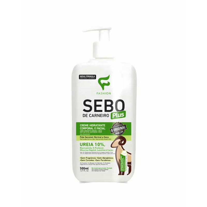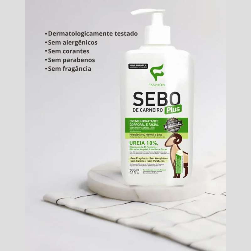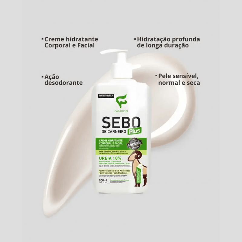 O Creme hidratante Sebo de Carneiro Plus Fashion foi desenvolvido para hidratação profunda e de longa duração das áreas mais ressecadas da pele. Possui em sua composição ativos importantes, tais como Niacinamida, Ureia 10%, D-Pantenol, Glicerina Vegetal, Lanolina e Cacau. Seu uso reestabelece o equilíbrio hídrico, protege e restaura a maciez da pele.