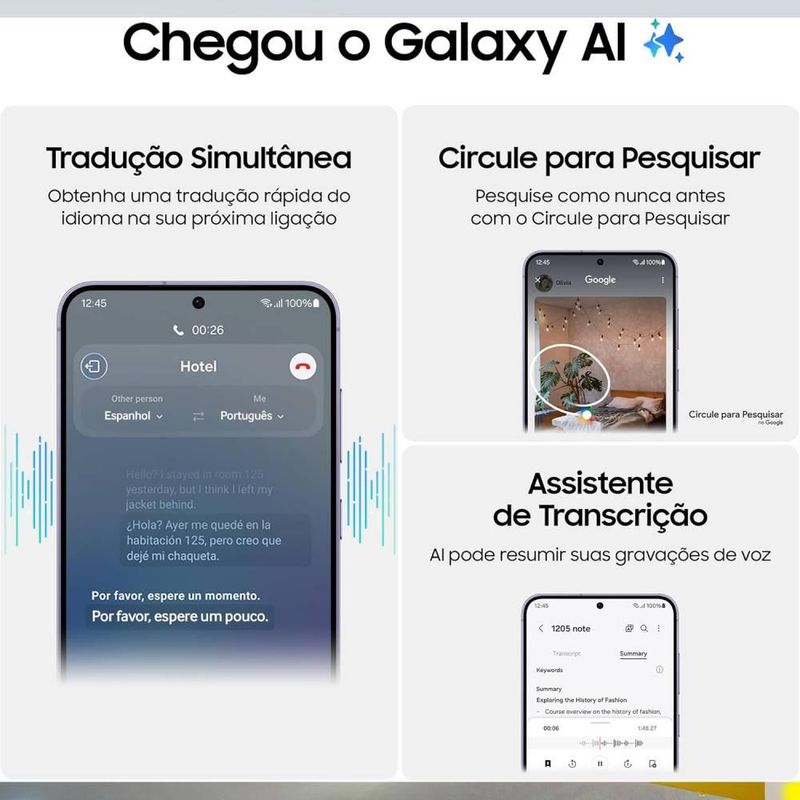 A Tradução Simultânea funciona tanto para chamadas telefônicas tradicionais quanto para a tradução de texto em qualquer aplicativo de troca de mensagens (WhatsApp, Direct do Instagram, SMS, Telegram, etc.). Por outro lado, a função Circular para Buscar permite procurar qualquer informação exibida na tela do aparelho. A IA da Samsung garante uma experiência adaptativa e personalizada.