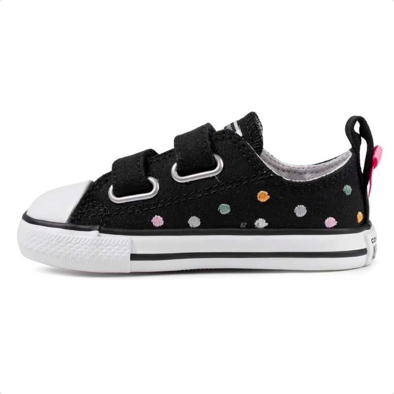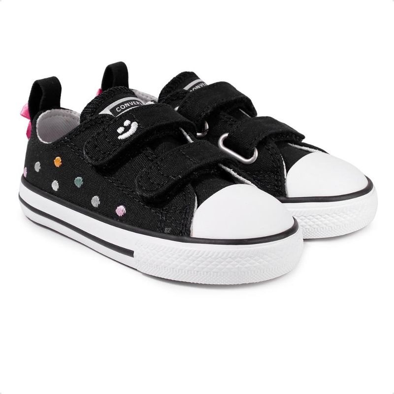 O Tênis Converse Chuck Taylor All Star 2V Polka Dots é puro charme e estilo para os pequenos! Com estampa de poás (polka dots) divertida e atemporal, ele traz a clássica silhueta Converse em uma versão infantil cheia de personalidade. Modelo conta com duas tiras em aderência que facilitam o calce e garantem maior autonomia para a criança.